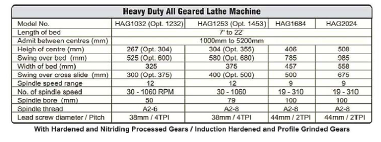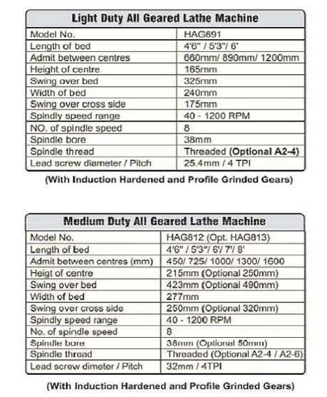 Hardened & Ground Bedways, Hardened & Profile Ground Headstock Gears, Norton Gear Box, Dog Chuck Plate, True Chuck Plate, Centre Adaptor, Dead Centre – 2 Nos., Tool Post Spanner, Oil Can, 3 HP (Class-F) Electric Motor with Push Button type operating panel and Instructions & Spare Parts Manual.